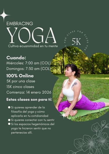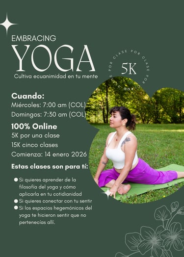 Quiero compartir este saber en construcción, que se alimenta constantemente de la experiencia, la práctica y el estudio que inició hace unos años. Soy profesora de yoga registrada - YTT con 200 horas de entrenamiento en yoga vinyasa y restaurativo, 20 horas en yoga sensible al trauma y 50 horas en yoga accesible, y tengo un diplomado en danza movimiento terapia.
